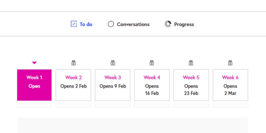 किसी पाठ्यक्रम का नि:शुल्क ऑडिट करते समय, सामग्री अब एक बार में जारी करने के बजाय सप्ताह-दर-सप्ताह जारी की जाती है।