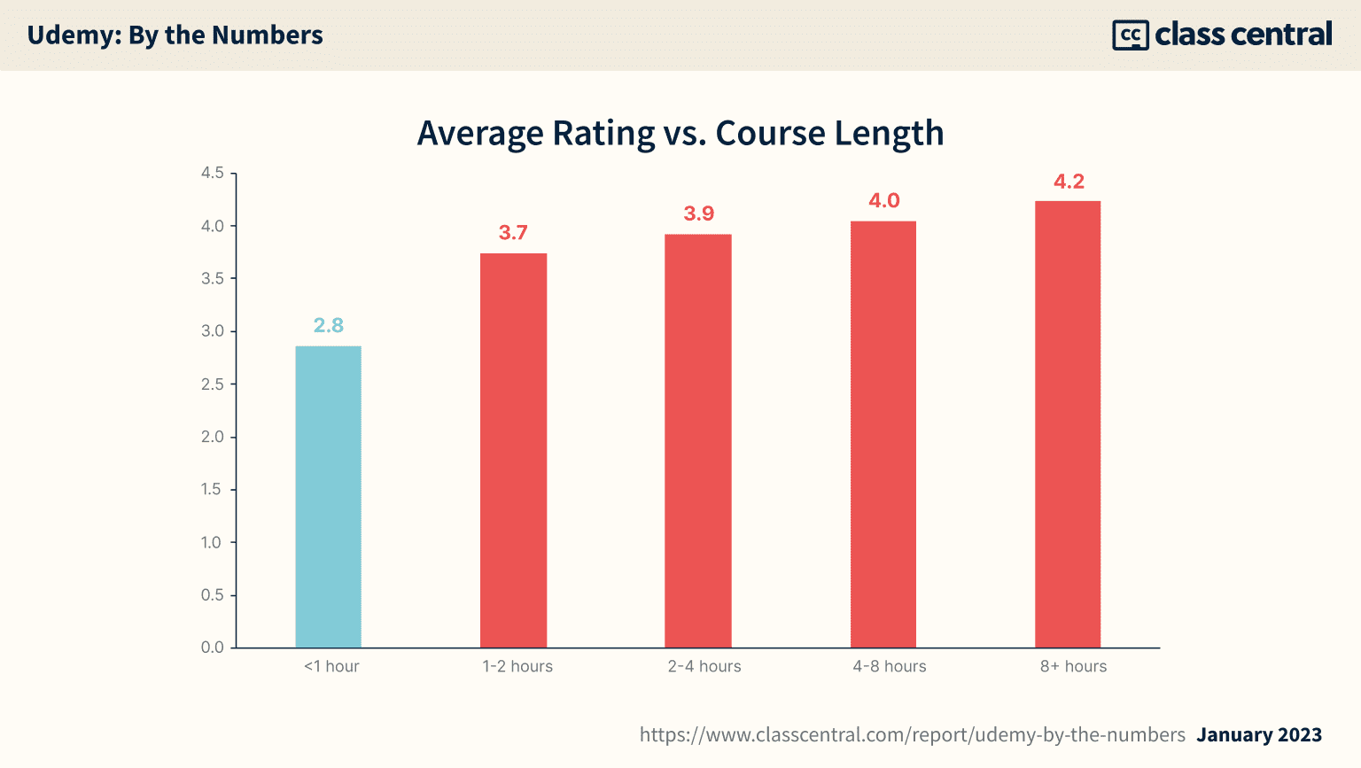 औसत पाठ्यक्रम की लंबाई 7.7 घंटे है, जबकि औसत 2.3 घंटे है। जैसे-जैसे पाठ्यक्रम की लंबाई बढ़ती है, औसत नामांकन भी बढ़ता है: शिक्षार्थी लंबे पाठ्यक्रमों की ओर आकर्षित होते हैं।