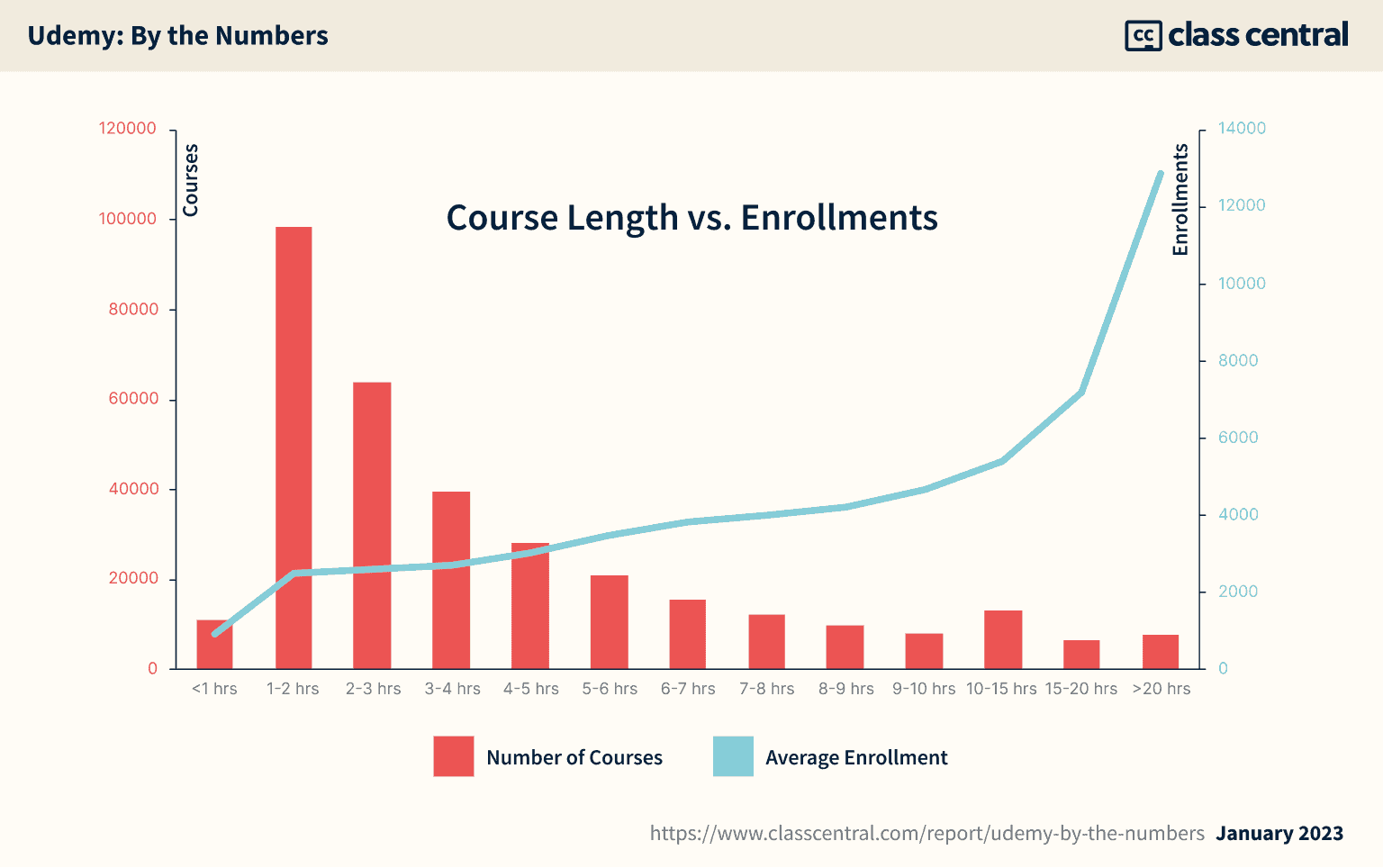 पाठ्यक्रम जो 1 घंटे से कम समय के हैं, उनका औसत नामांकन 930 है, जबकि 15-20 घंटे लंबे पाठ्यक्रम का औसत नामांकन 5,300 है। 20 घंटे से अधिक 6,000 से अधिक पाठ्यक्रम हैं - उनका औसत नामांकन 12,875 है।