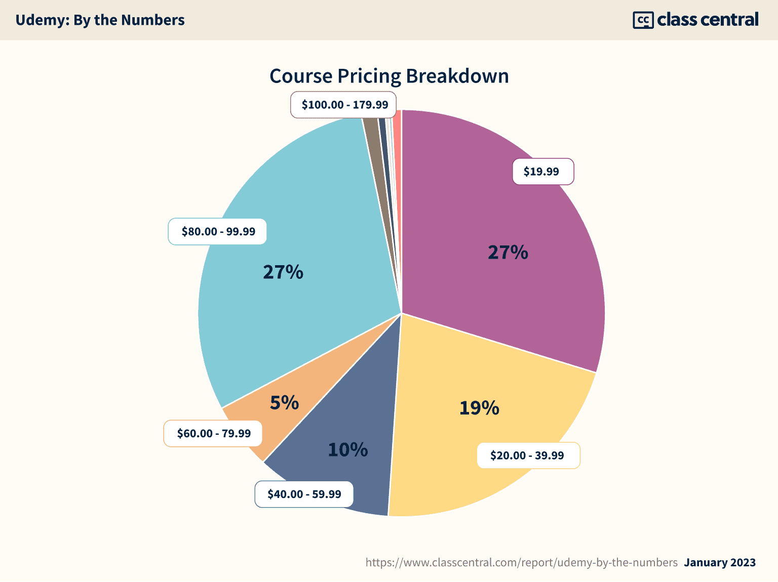 उडेमी के लगभग 40% पाठ्यक्रमों की लागत $30 से कम है, जबकि 3% की लागत $100 से अधिक है। जब हमने 2021 में डेटा का विश्लेषण किया, तो 24% पाठ्यक्रमों की लागत $100 से अधिक थी।