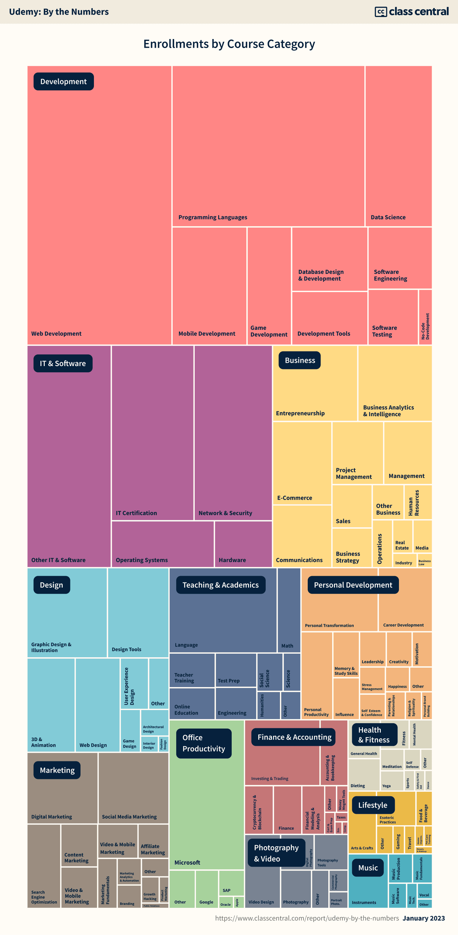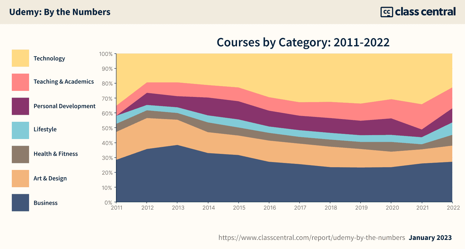 उडेमी के आधे से अधिक पाठ्यक्रम व्यवसाय और प्रौद्योगिकी के क्षेत्रों से संबंधित हैं, लेकिन वे सभी नामांकनों का 74.6% हिस्सा हैं।
