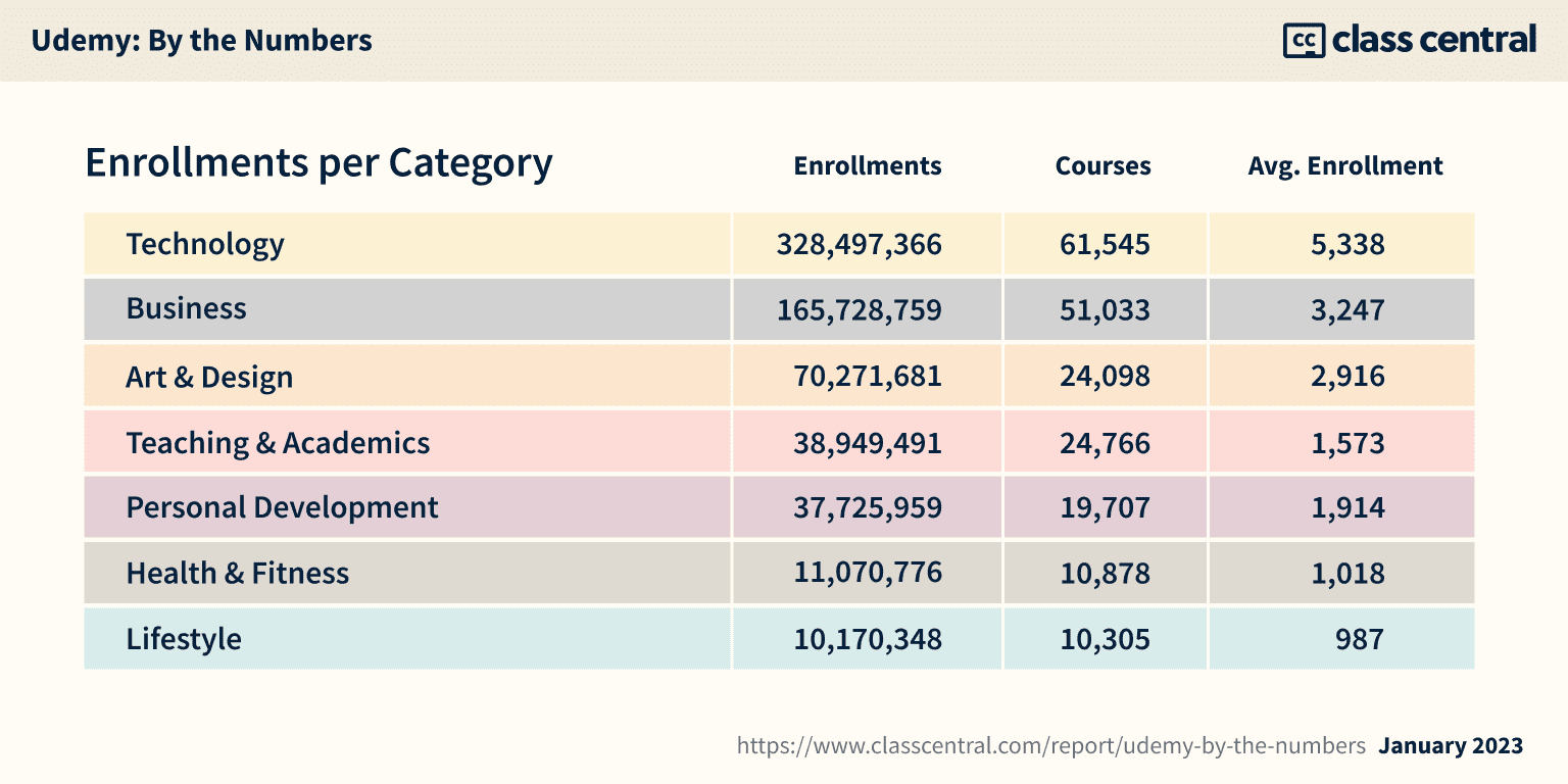 प्रौद्योगिकी पाठ्यक्रम सबसे लोकप्रिय हैं। उनके पास प्रति कोर्स औसतन 5340 शिक्षार्थी हैं, जो पूरे प्लेटफॉर्म पर 3270 के औसत से काफी ऊपर है।