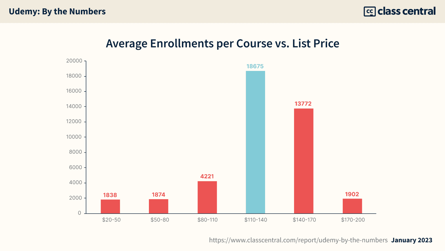 सूची मूल्य में परिवर्तन का अर्थ यह नहीं है कि शिक्षार्थियों द्वारा भुगतान की जाने वाली वास्तविक कीमत बदल गई है। उडेमी की 2021 की वार्षिक रिपोर्ट के आंकड़ों के आधार पर , एक शिक्षार्थी द्वारा भुगतान की जाने वाली औसत कीमत $20.4 है, जबकि एक पाठ्यक्रम की न्यूनतम सूचीबद्ध कीमत $19.99 है।