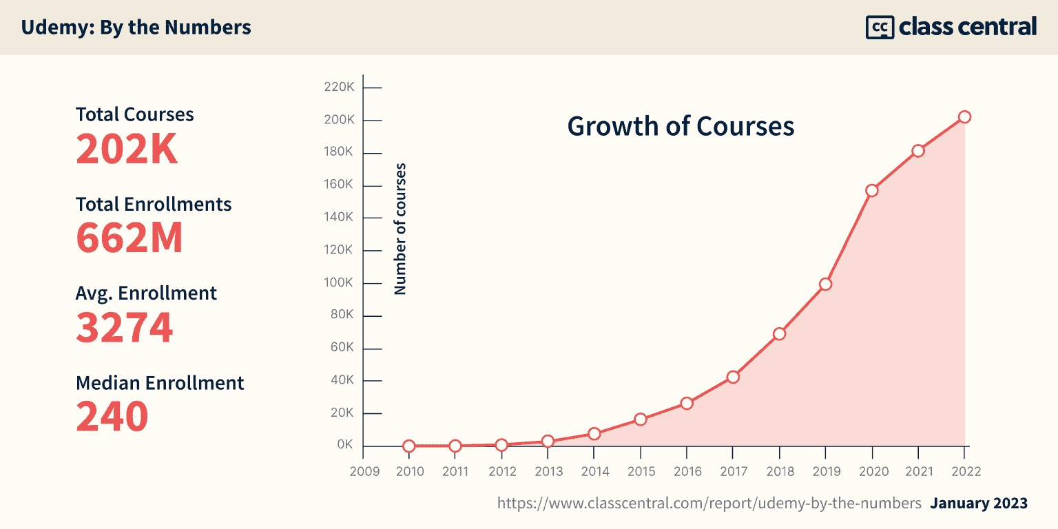 मेरे सहयोगी @Archisha के साथ Udemy के कैटलॉग का विश्लेषण करते हुए , हमने पाया कि वर्तमान में उनके पास 202,000 से अधिक पाठ्यक्रम हैं - जो कि पिछले 2 वर्षों में 33% की वृद्धि है। आपको उडेमी के कैटलॉग का संपूर्ण विश्लेषण यहां मिल सकता है: 202K पाठ्यक्रम, 662M नामांकन: ब्रेकिंग डाउन उडेमी की विशाल सूची ।
